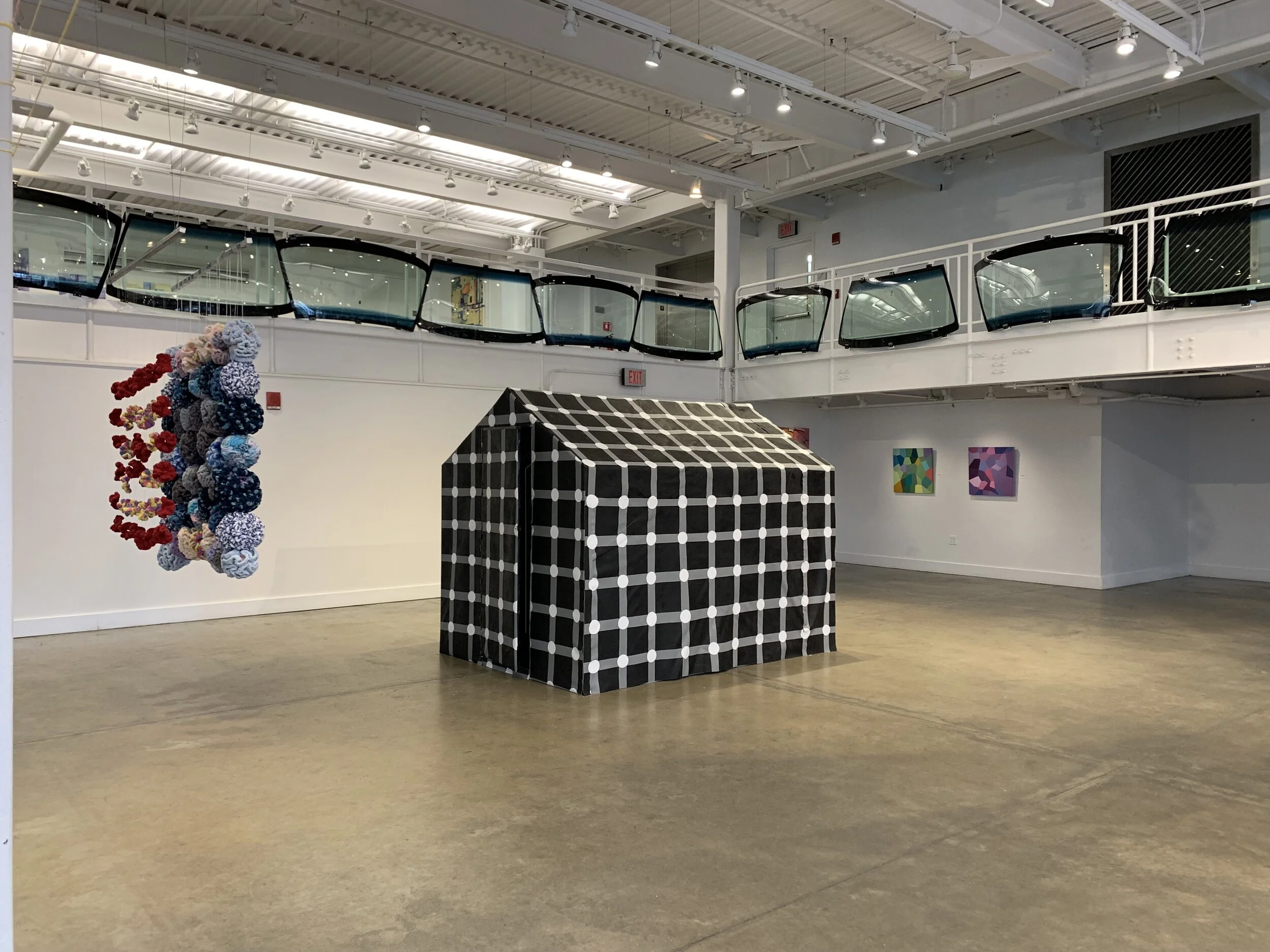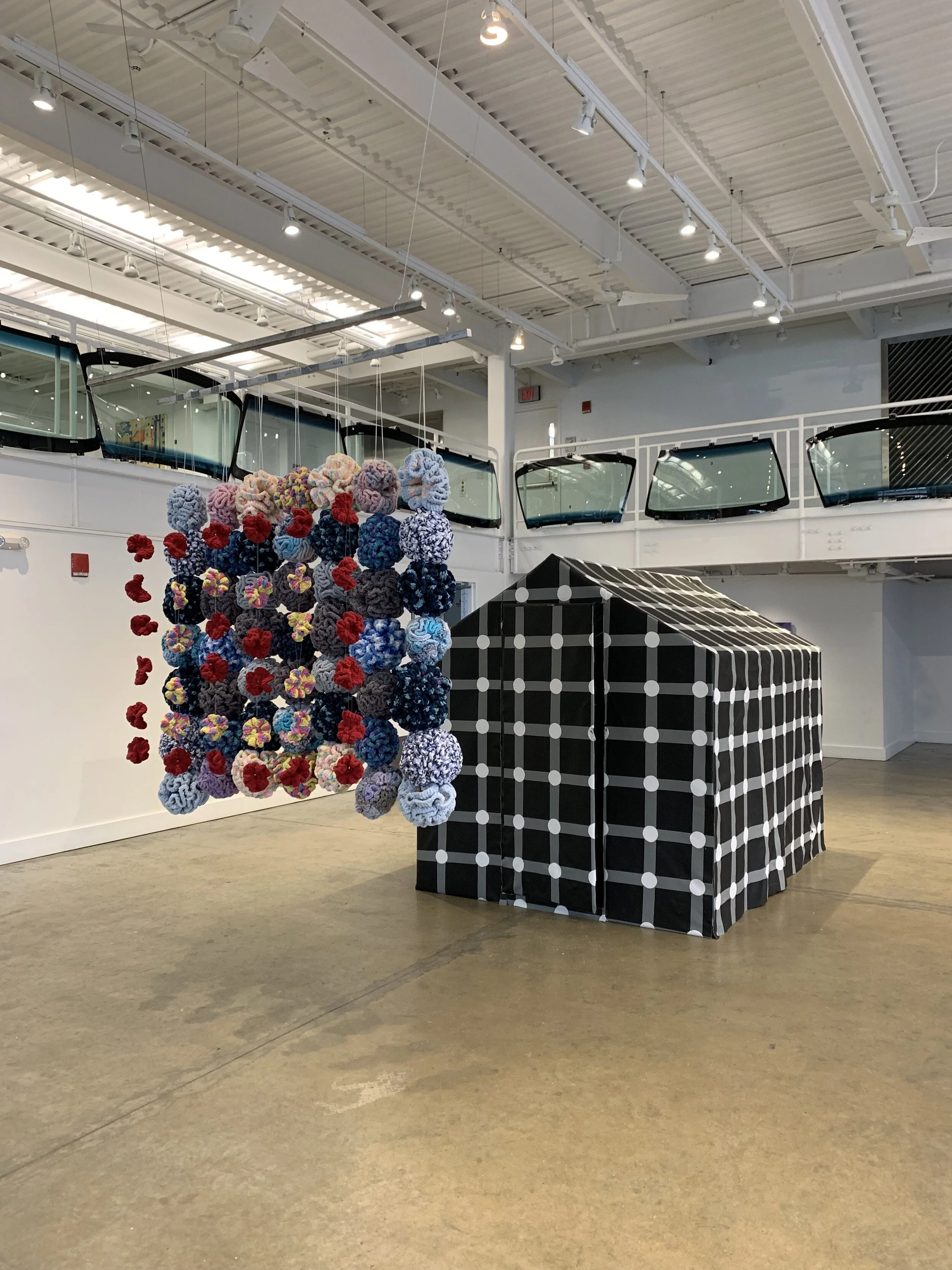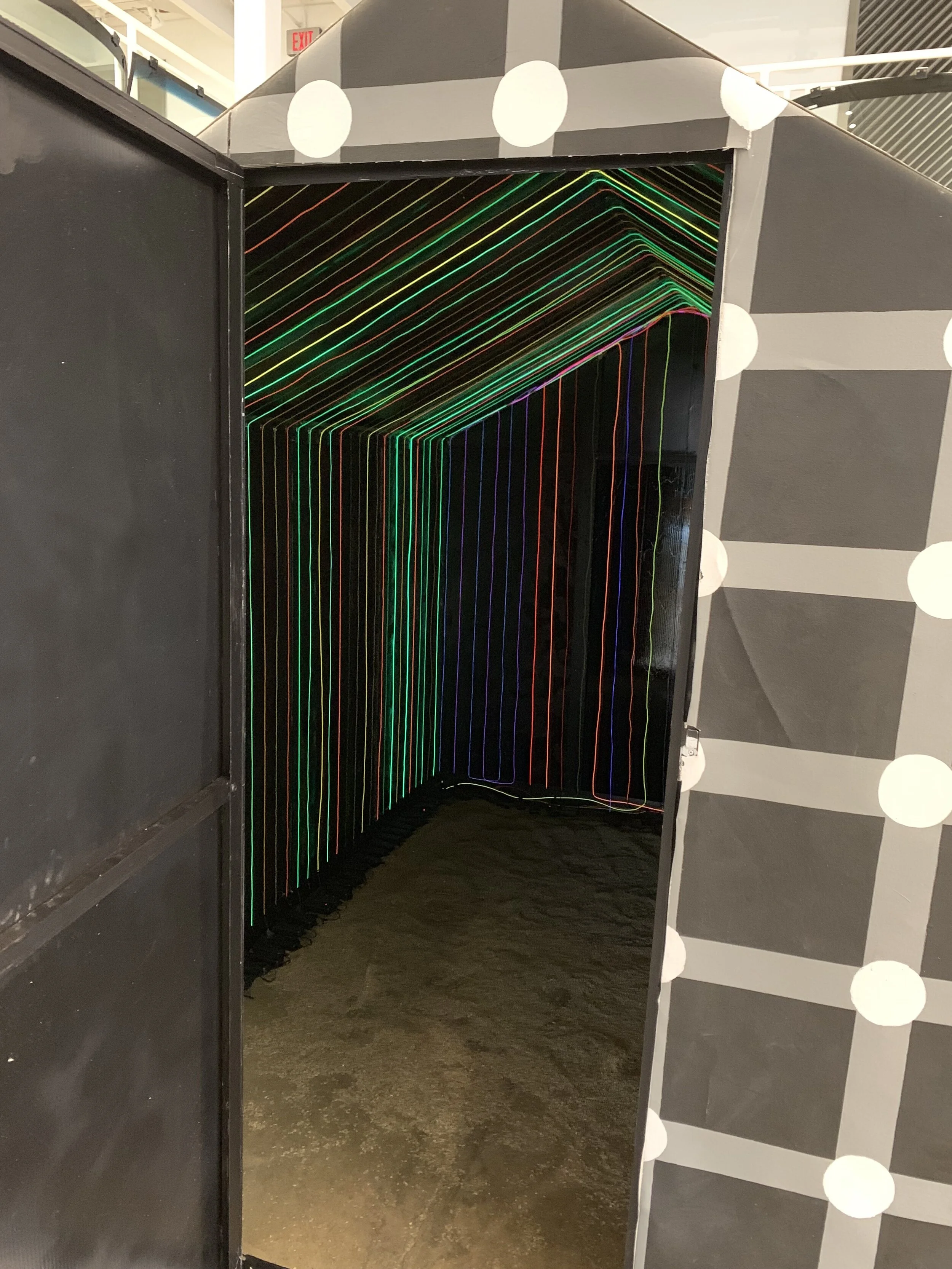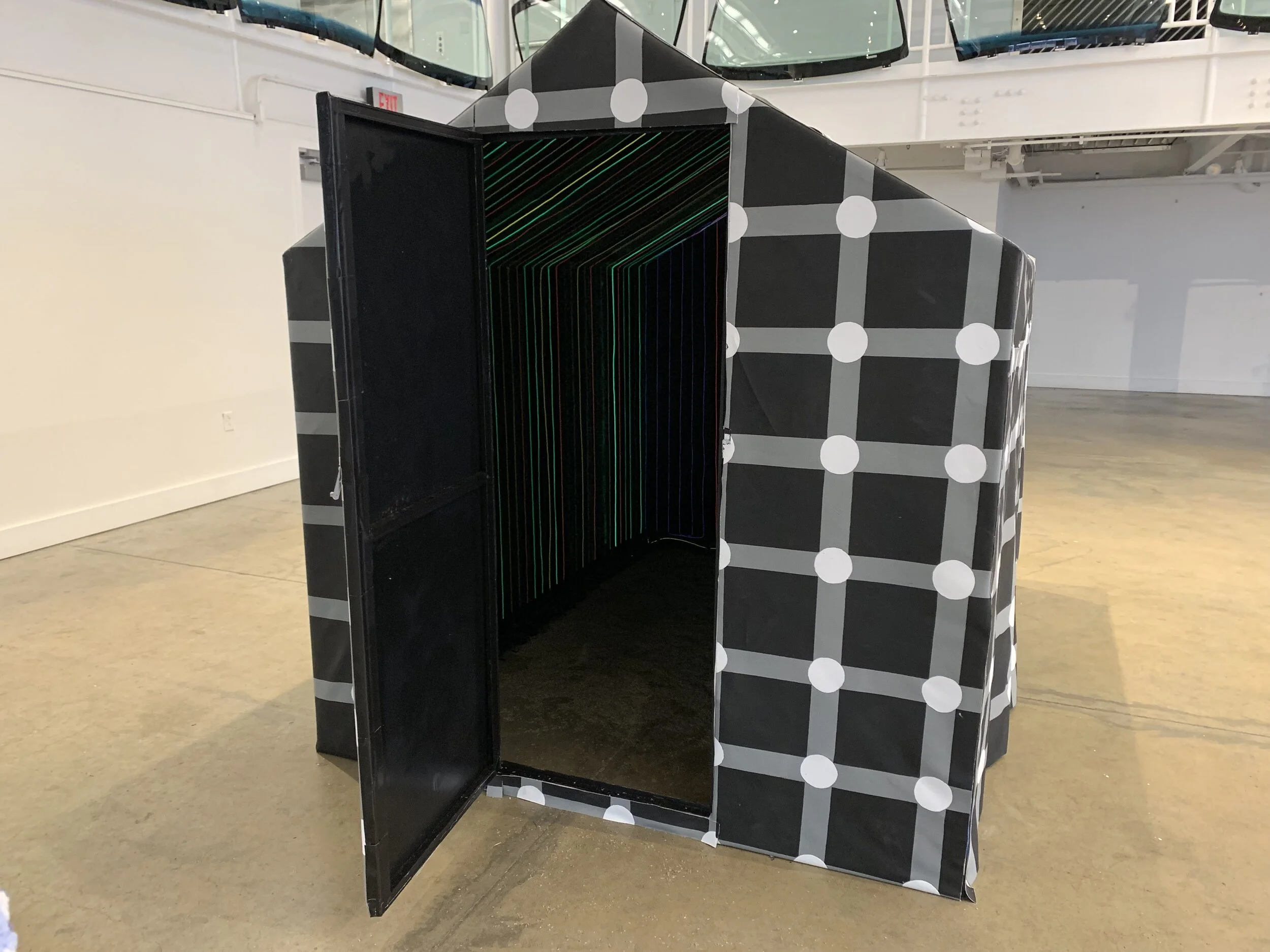 The viewer was invited into an experience full of texture that collided with one another. Dried lavender on the floor is meant to be calming, while the flashing lights created an overwhelming experience. The crochet functions as a wall or boundary before the viewer is allowed to enter the house. An optical illusion is painted on the house's exterior, inviting the viewer close only to have a conflicting experience inside. This piece was about the inability to calm down surrounded by violence and uncertainty.