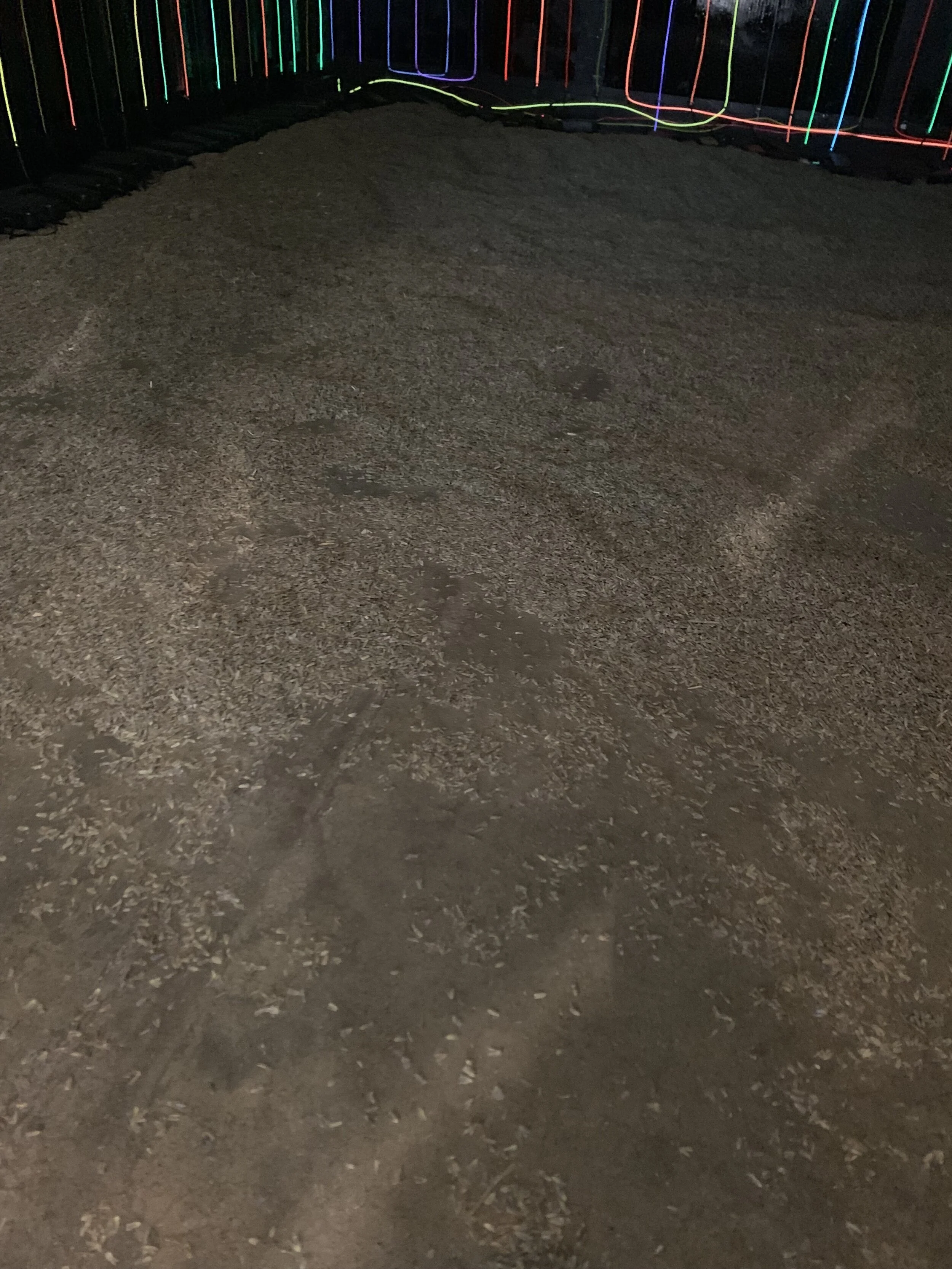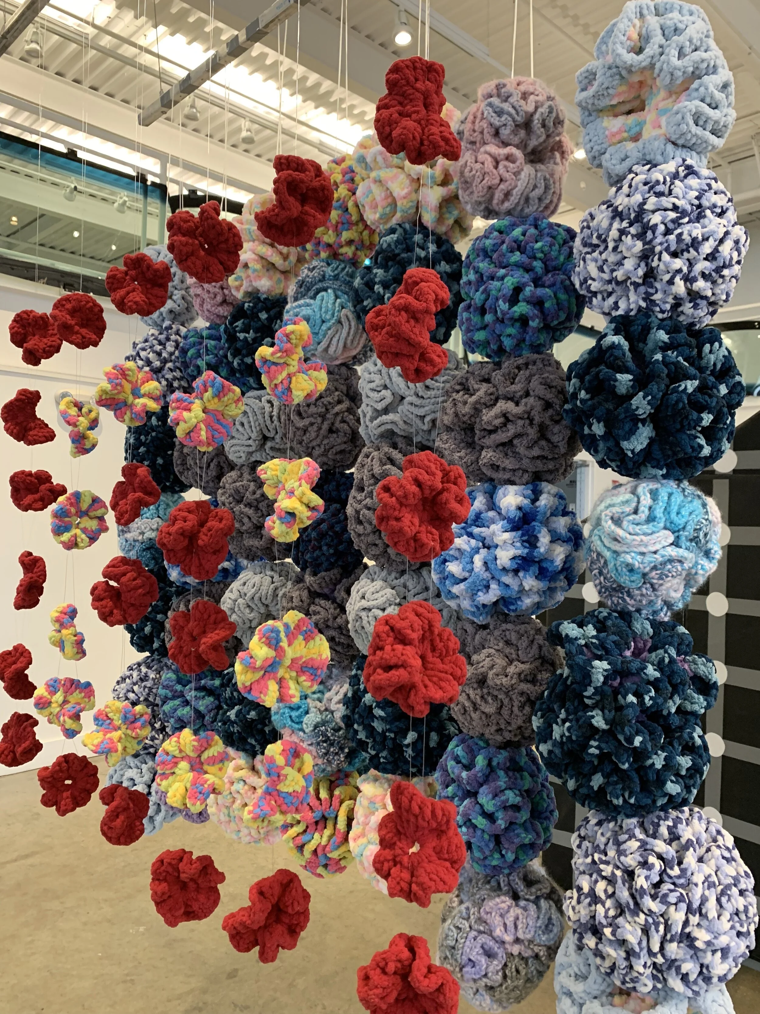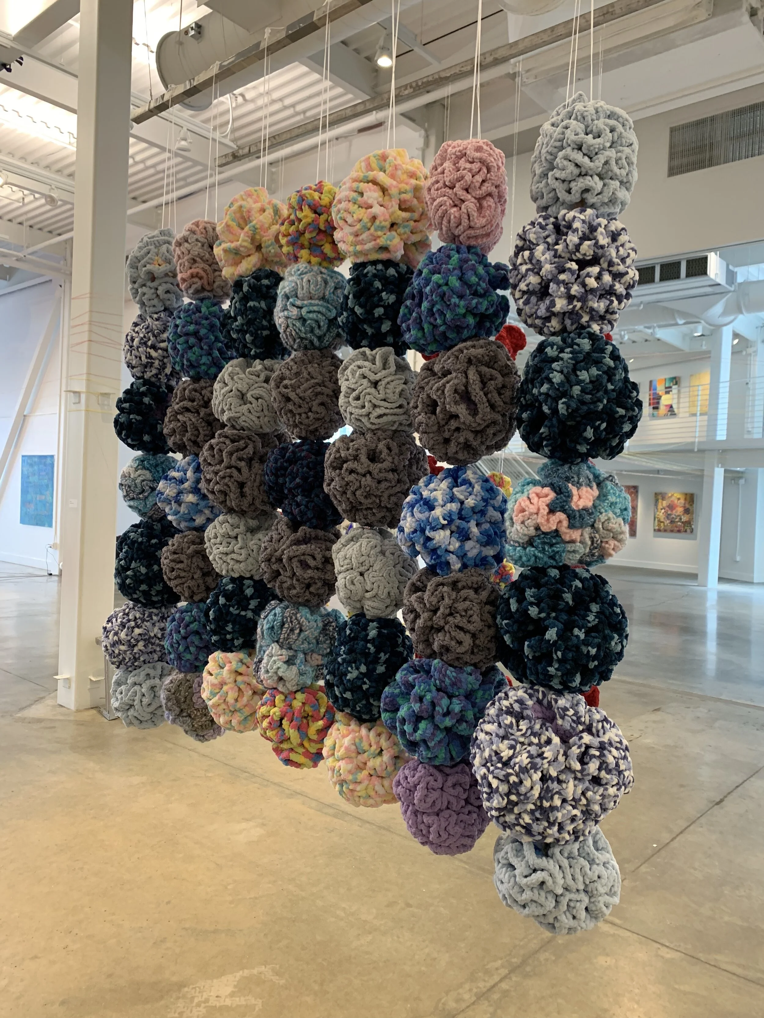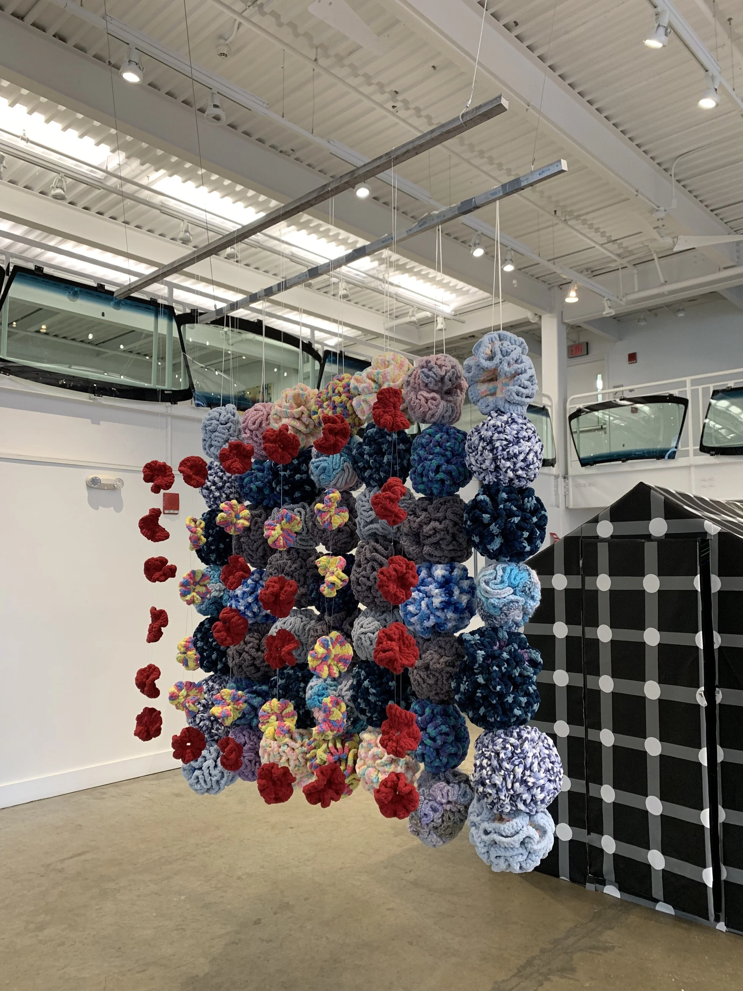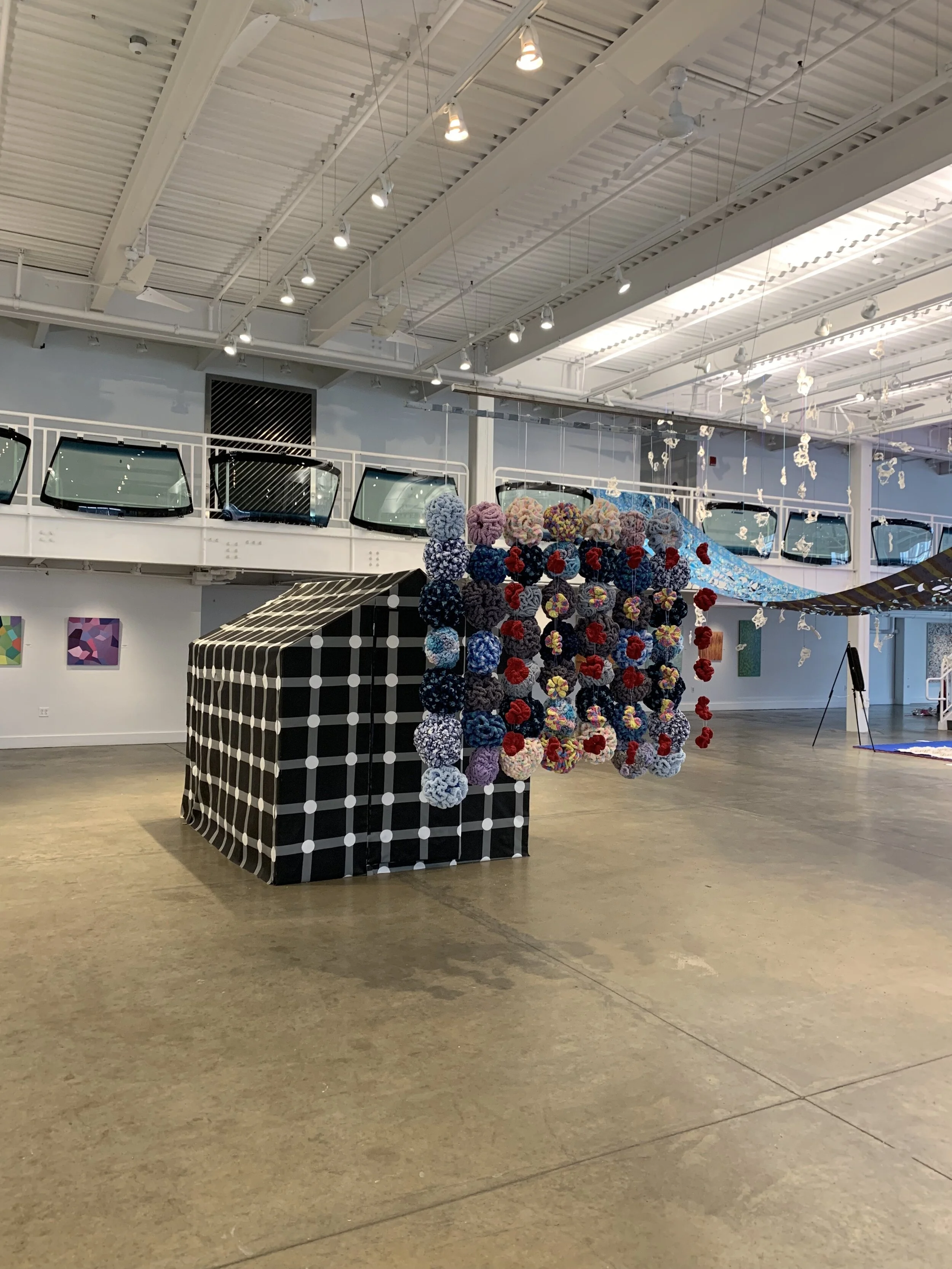 The viewer was invited into an experience full of texture that collided with one another. Dried lavender on the floor is meant to be calming, while the flashing lights created an overwhelming experience. The crochet functions as a wall or boundary before the viewer is allowed to enter the house. An optical illusion is painted on the house's exterior, inviting the viewer close only to have a conflicting experience inside. This piece was about the inability to calm down surrounded by violence and uncertainty.