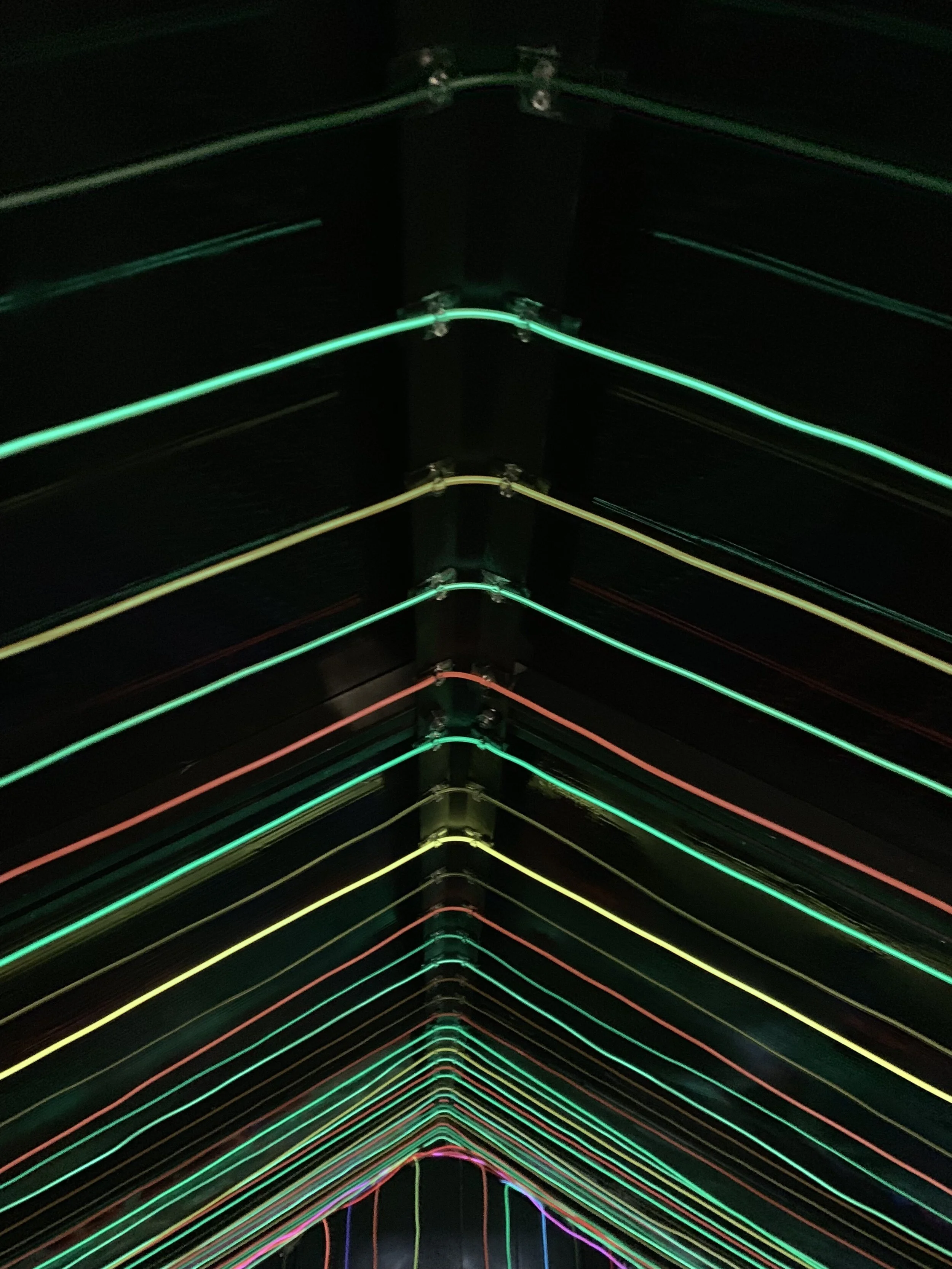 What is the value of affinity spaces? Whose work is craft? Why is handwork not intelligent? How have affinity spaces created alternative forms of sociality and relationally that is necessary for progress? I researched quilting bees, gendered affinity spaces that became revolutionary centers for social movements, and historical progress that leads to the segregation within the feminist movement. I worked with recycled cardboard boxes, fabric, and towels to build a room filled with triangular prisms, thereby creating a three-dimensional quilt. I created a space that looks rather dull from the outside, a space where the viewer needs to decide to enter. This is a reinstallation of this piece over one wall instead of five to re-imagine another form for the piece. The aesthetic of the quilt is inspired by my auditory processing disorder, which makes background noise loud for me. Environments, where there are many sounds layered on top of each other (such as soft music or people talking), is overwhelming for me. This environment demonstrates what background noise feels like to me.