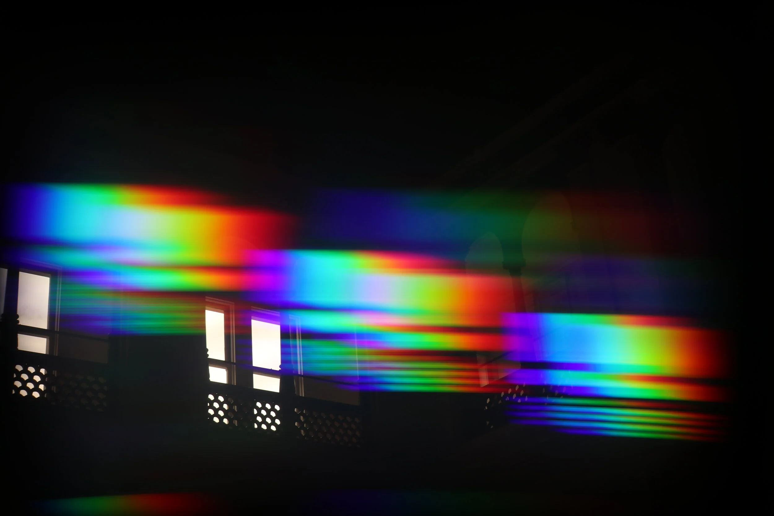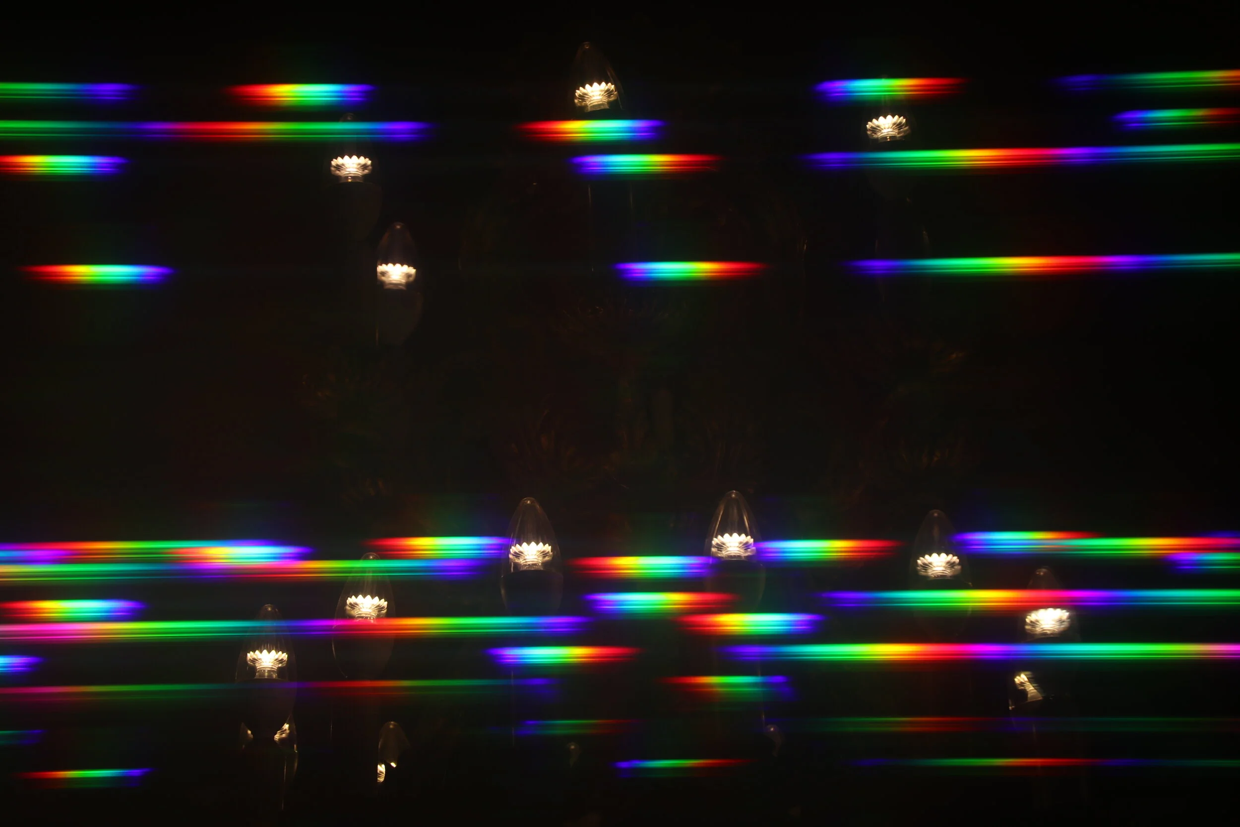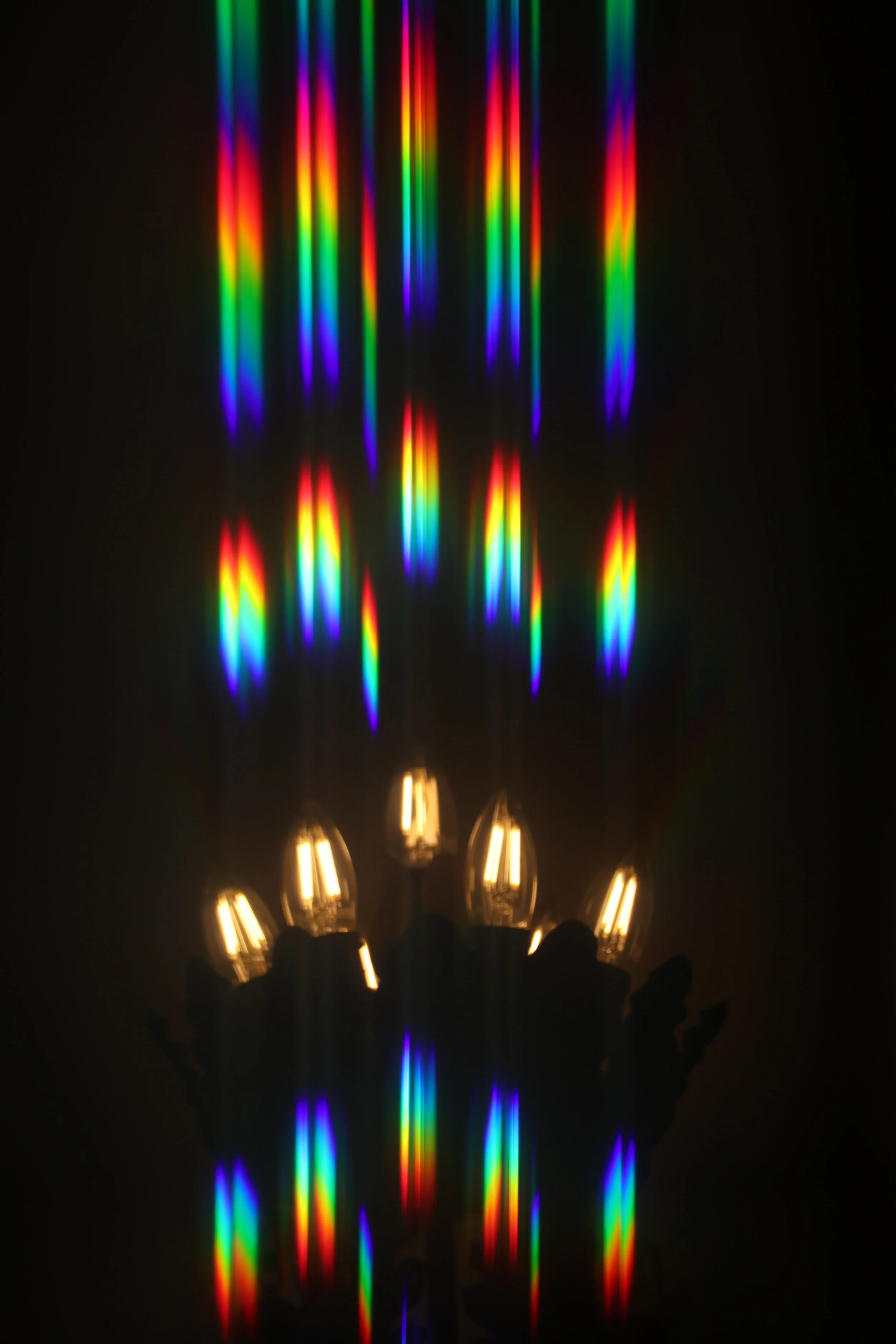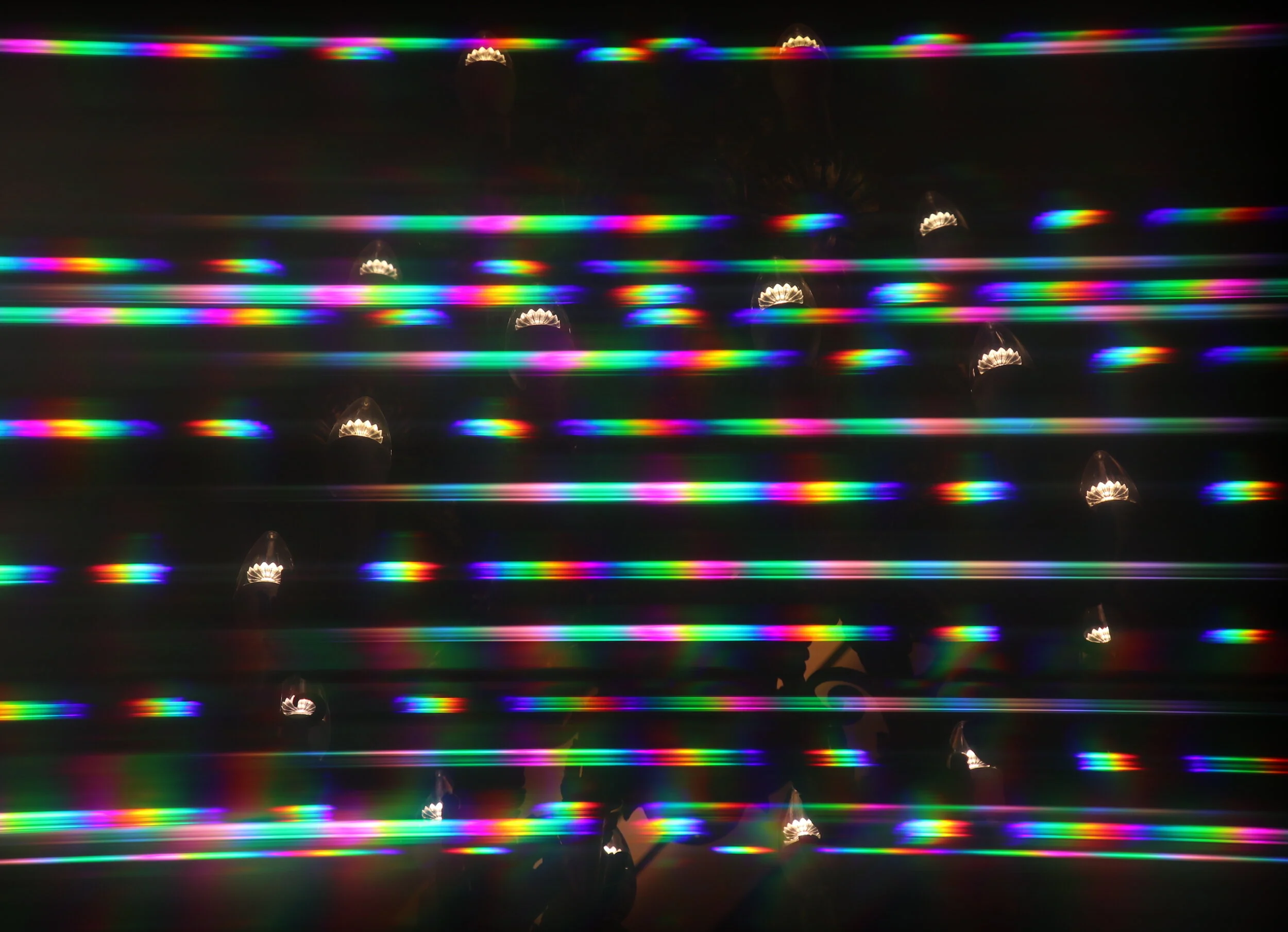 I became interested in the diffraction interference pattern from the chandelier on the library's LCD TV screen. I used this phenomenon as a springboard to launch into my photography project. For my project, I used different diffraction gratings as filters to take pictures that highlight the different diffraction patterns from white light. A diffraction grating consists of a large number of parallel grooves that function like a supersized double-slit interference pattern creating a diffraction pattern from white light. The quality, number, and spacing of the slots is crucial to the grating's performance, affecting the clarity and separation of the diffraction pattern. I was interested in the simple diffraction concept to highlight the invisible forces around us that only need a small piece of glass with 600 slits to reveal. The process was quite simple. I used multiple different diffraction gratings as filters to capture the diffraction patterns from various light sources.