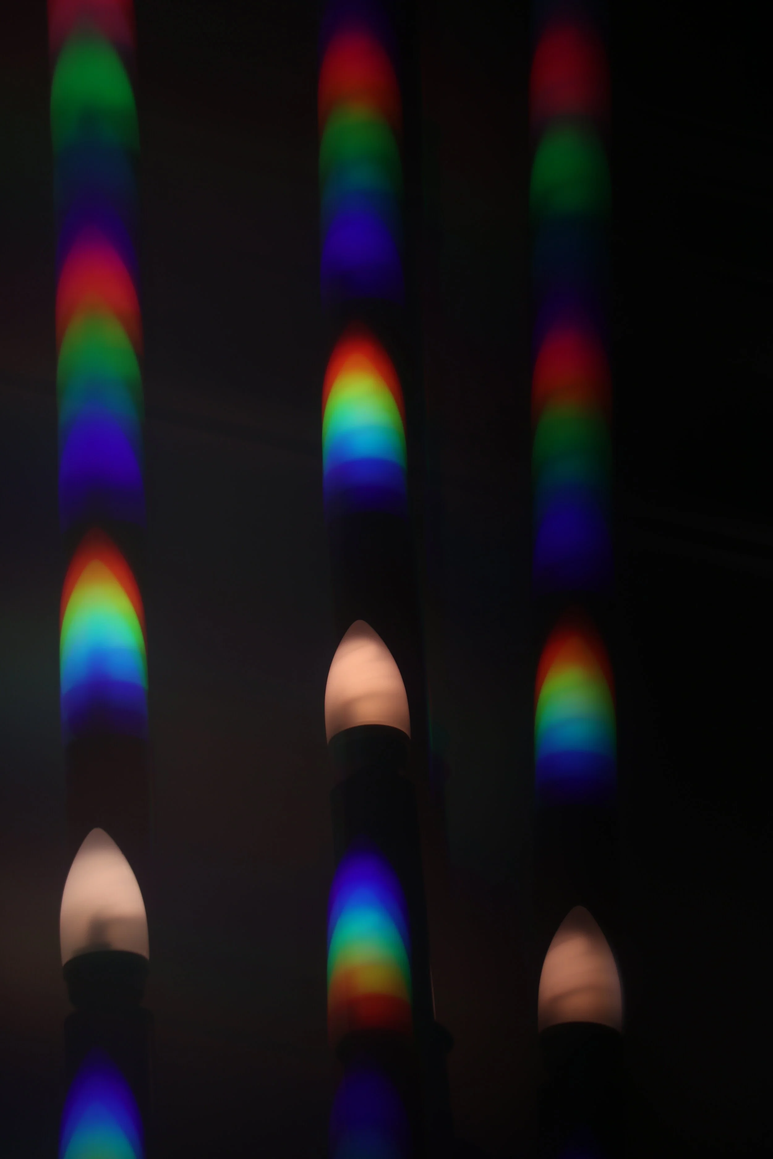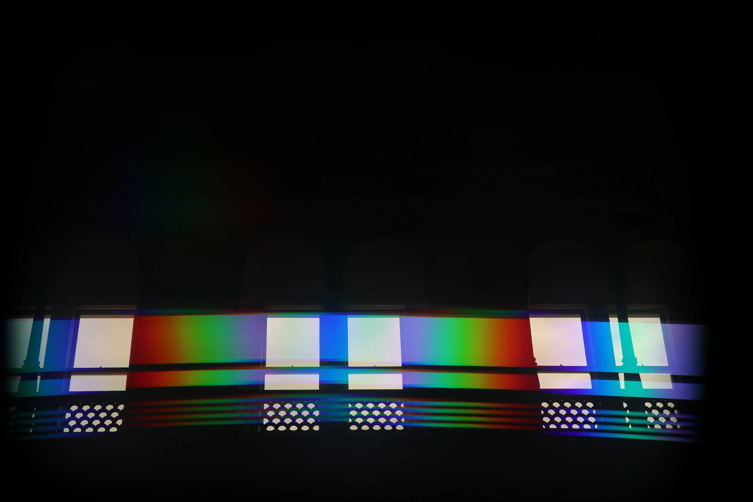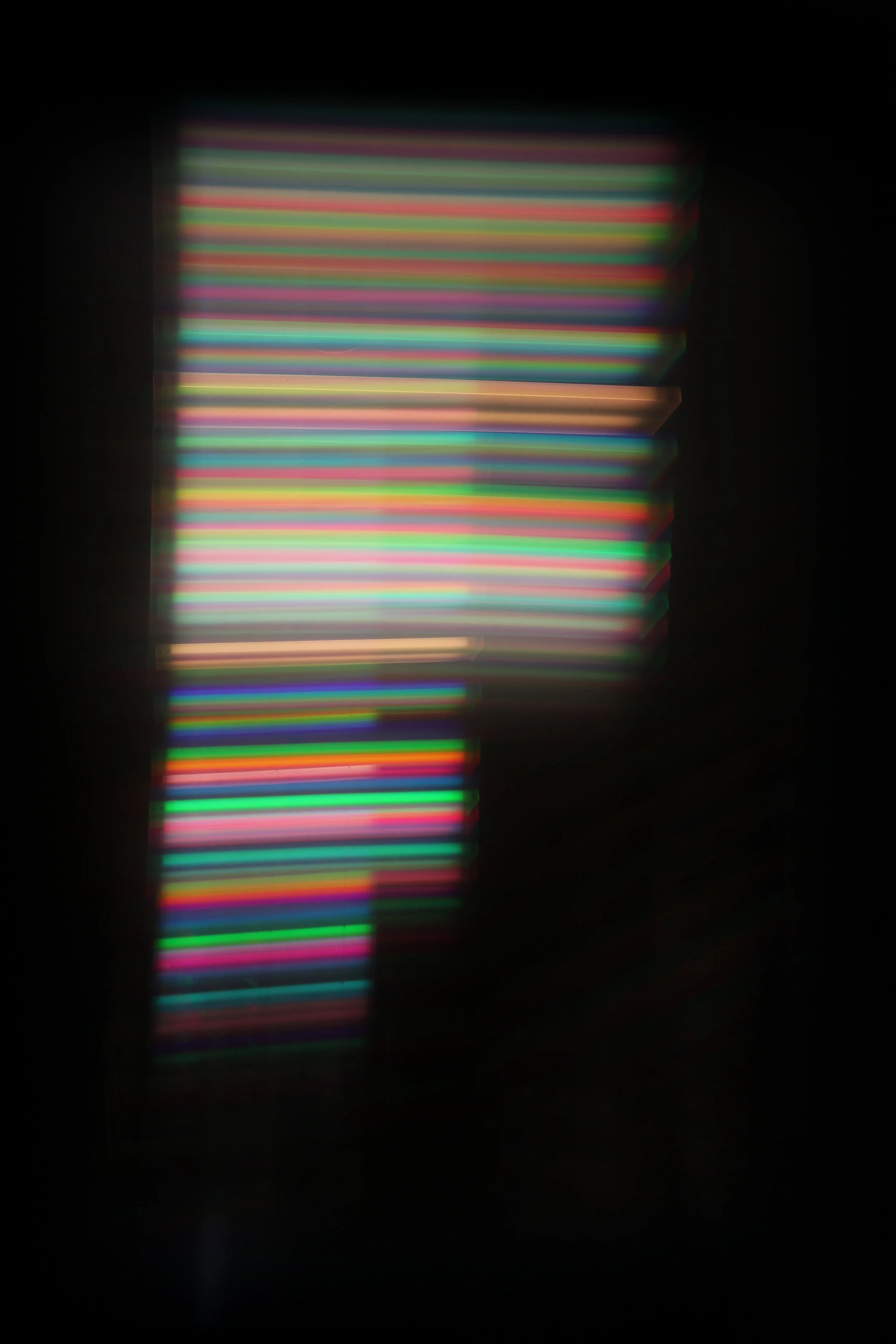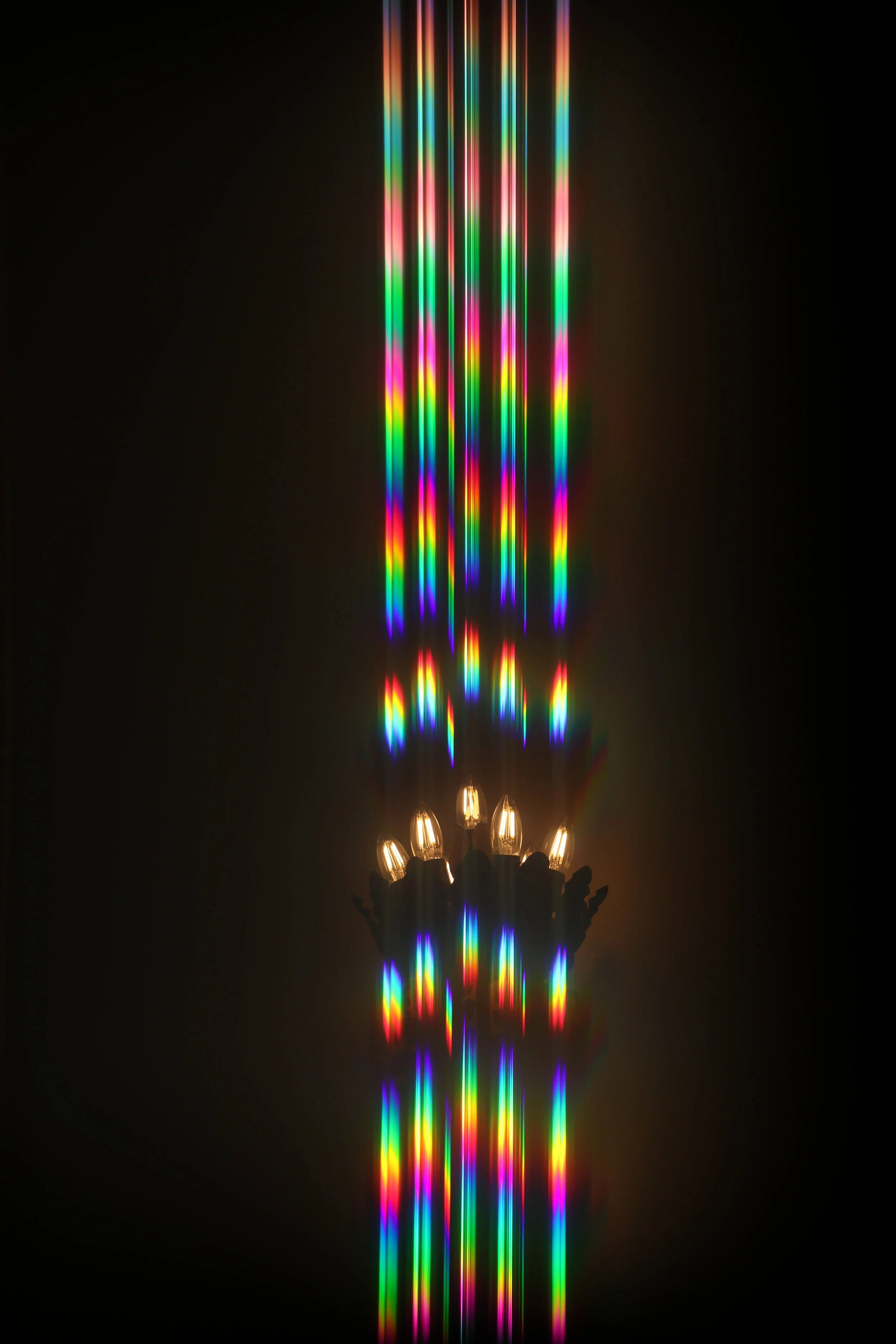I became interested in the diffraction interference pattern from the chandelier on the library's LCD TV screen. I used this phenomenon as a springboard to launch into my photography project. For my project, I used different diffraction gratings as filters to take pictures that highlight the different diffraction patterns from white light. A diffraction grating consists of a large number of parallel grooves that function like a supersized double-slit interference pattern creating a diffraction pattern from white light. The quality, number, and spacing of the slots is crucial to the grating's performance, affecting the clarity and separation of the diffraction pattern. I was interested in the simple diffraction concept to highlight the invisible forces around us that only need a small piece of glass with 600 slits to reveal. The process was quite simple. I used multiple different diffraction gratings as filters to capture the diffraction patterns from various light sources.